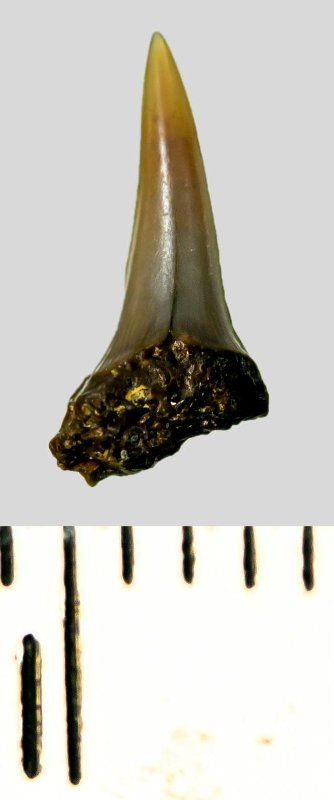 Зуб (фрагмент). Акула. Eostriatolamia subulata (Agassiz, 1843). Классификация: Хордовые Chordata, Позвоночные Vertebrata, Хрящевые рыбы Chondrichthyes, Пластиножаберные Elasmobranchii, Акулы Selachii, Ламнообразные Lamniformes, Песчаные акулы Odontaspididae