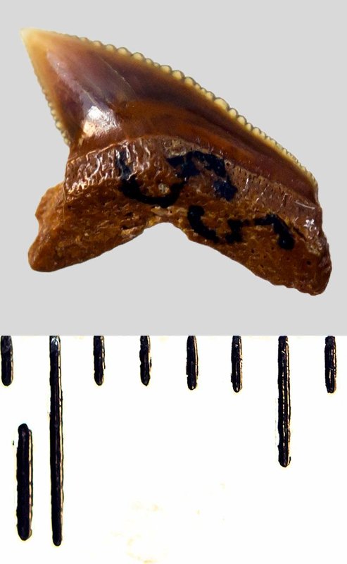 Зуб. Акула. Palaeoanacorax volgensis Glikman, 1971. Классификация: Хордовые Chordata, Позвоночные Vertebrata, Хрящевые рыбы Chondrichthyes, Пластиножаберные Elasmobranchii, Акулы Selachii, Ламнообразные Lamniformes, Anacoracidae