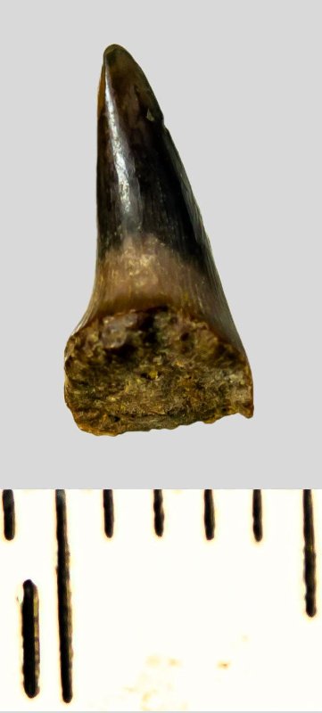 Зуб (фрагмент). Акула. Synechodus dubrisiensis (Mackie, 1863). Классификация: Хордовые Chordata, Позвоночные Vertebrata, Хрящевые рыбы Chondrichthyes, Пластиножаберные Elasmobranchii, Акулы Selachii, Синеходонтообразные Synechodontiformes, Palaeospinacidae