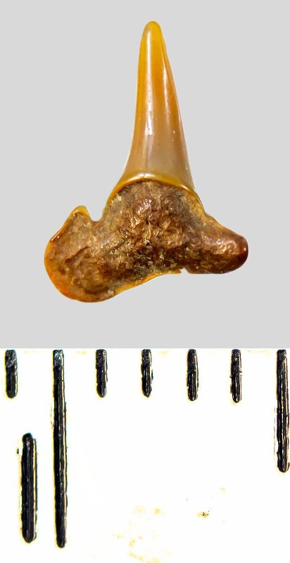 Зуб (фрагмент). Акула. Synechodus dubrisiensis (Mackie, 1863). Классификация: Хордовые Chordata, Позвоночные Vertebrata, Хрящевые рыбы Chondrichthyes, Пластиножаберные Elasmobranchii, Акулы Selachii, Синеходонтообразные Synechodontiformes, Palaeospinacidae