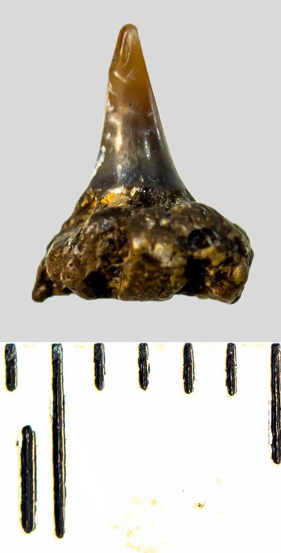 Зуб (фрагмент). Акула. Synechodus dubrisiensis (Mackie, 1863). Классификация: Хордовые Chordata, Позвоночные Vertebrata, Хрящевые рыбы Chondrichthyes, Пластиножаберные Elasmobranchii, Акулы Selachii, Синеходонтообразные Synechodontiformes, Palaeospinacidae