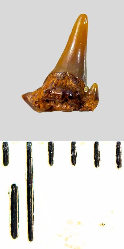 Зуб (фрагмент). Акула. Synechodus dubrisiensis (Mackie, 1863). Классификация: Хордовые Chordata, Позвоночные Vertebrata, Хрящевые рыбы Chondrichthyes, Пластиножаберные Elasmobranchii, Акулы Selachii, Синеходонтообразные Synechodontiformes, Palaeospinacidae