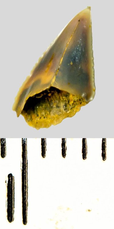 Зуб (фрагмент). Акула. Palaeoanacorax volgensis Glickman, 1971. Классификация: Хордовые Chordata, Позвоночные Vertebrata, Хрящевые рыбы Chondrichthyes, Пластиножаберные Elasmobranchii, Акулы Selachii, Ламнообразные Lamniformes, Anacoracidae