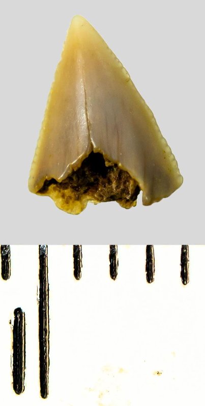 Зуб (фрагмент). Акула. Palaeoanacorax volgensis Glickman, 1971. Классификация: Хордовые Chordata, Позвоночные Vertebrata, Хрящевые рыбы Chondrichthyes, Пластиножаберные Elasmobranchii, Акулы Selachii, Ламнообразные Lamniformes, Anacoracidae