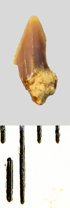 Зуб (фрагмент). Акула. Palaeoanacorax volgensis Glickman, 1971. Классификация: Хордовые Chordata, Позвоночные Vertebrata, Хрящевые рыбы Chondrichthyes, Пластиножаберные Elasmobranchii, Акулы Selachii, Ламнообразные Lamniformes, Anacoracidae