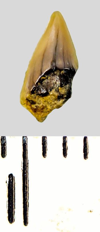 Зуб (фрагмент). Акула. Palaeoanacorax volgensis Glickman, 1971. Классификация: Хордовые Chordata, Позвоночные Vertebrata, Хрящевые рыбы Chondrichthyes, Пластиножаберные Elasmobranchii, Акулы Selachii, Ламнообразные Lamniformes, Anacoracidae