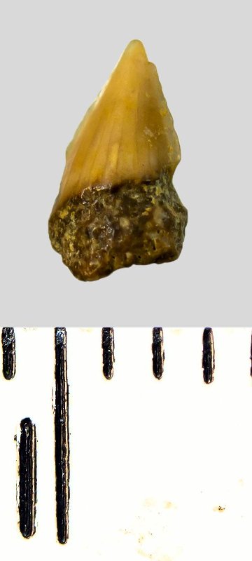 Зуб (фрагмент). Акула. Palaeoanacorax volgensis Glickman, 1971. Классификация: Хордовые Chordata, Позвоночные Vertebrata, Хрящевые рыбы Chondrichthyes, Пластиножаберные Elasmobranchii, Акулы Selachii, Ламнообразные Lamniformes, Anacoracidae