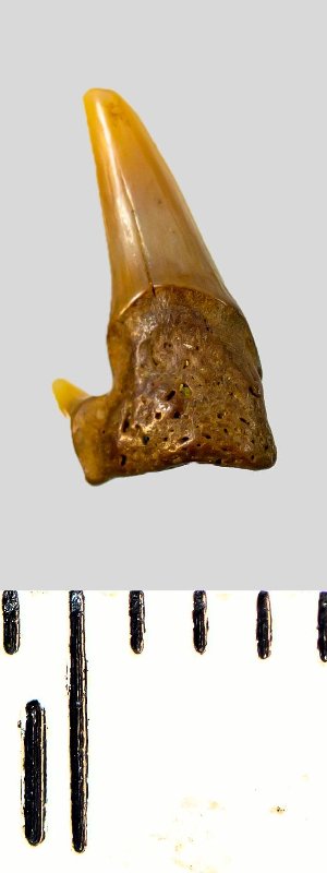 Зуб (фрагмент). Акула. Protolamna cf. sokolovi Cappetta, 1980. Классификация: Хордовые Chordata, Позвоночные Vertebrata, Хрящевые рыбы Chondrichthyes, Пластиножаберные Elasmobranchii, Акулы Selachii, Ламнообразные Lamniformes, Pseudoscapanorhynchidae