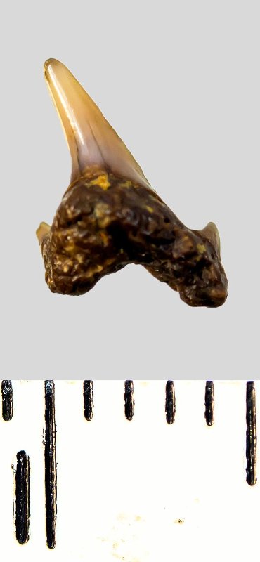 Зуб. Акула. Protolamna cf. sokolovi Cappetta, 1980. Классификация: Хордовые Chordata, Позвоночные Vertebrata, Хрящевые рыбы Chondrichthyes, Пластиножаберные Elasmobranchii, Акулы Selachii, Ламнообразные Lamniformes, Pseudoscapanorhynchidae