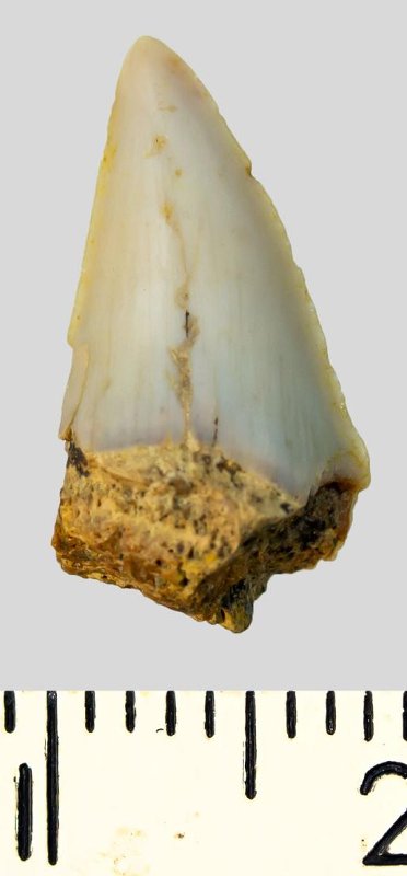 Зуб (фрагмент). Акула. Cretoxyrhinidae gen. indet. Классификация: Хордовые Chordata, Позвоночные Vertebrata, Хрящевые рыбы Chondrichthyes, Пластиножаберные Elasmobranchii, Акулы Selachii, Ламнообразные Lamniformes, Cretoxyrhinidae