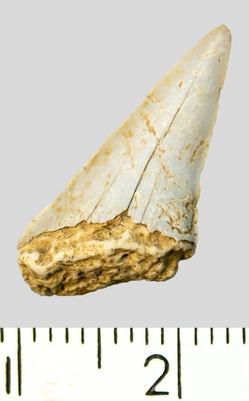 Зуб (фрагмент). Акула. Cretoxyrhina denticulata (Glueckman, 1957). Классификация: Хордовые Chordata, Позвоночные Vertebrata, Хрящевые рыбы Chondrichthyes, Пластиножаберные Elasmobranchii, Акулы Selachii, Ламнообразные Lamniformes, Cretoxyrhinidae