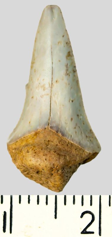 Зуб (фрагмент). Акула. Cretoxyrhina denticulata (Glueckman, 1957). Классификация: Хордовые Chordata, Позвоночные Vertebrata, Хрящевые рыбы Chondrichthyes, Пластиножаберные Elasmobranchii, Акулы Selachii, Ламнообразные Lamniformes, Cretoxyrhinidae