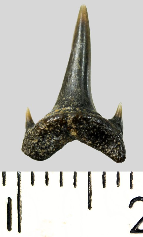 Мелкий боковой зуб с коронкой серого цвета, колюще-режущего типа, S-образно изогнутой, с гладким режущим краем. С лингвальной стороны у основания коронки на эмали имеется скульптура в виде слабой продольной струйчатости. Корень охристый, арочный, умеренно массивный, со следами окатанности. С лингвальной стороны корня одна питательная борозда. Присутствует одна пара добавочных зубцов коронки.