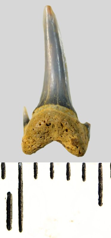 Мелкий боковой зуб с коронкой серого цвета, колюще-режущего типа, S-образно изогнутой, с гладким режущим краем. С лингвальной стороны у основания коронки на эмали имеется скульптура в виде слабой продольной струйчатости. Корень охристый, арочный, умеренно массивный, со следами окатанности. С лингвальной стороны корня одна питательная борозда. Присутствует одна пара добавочных зубцов коронки.