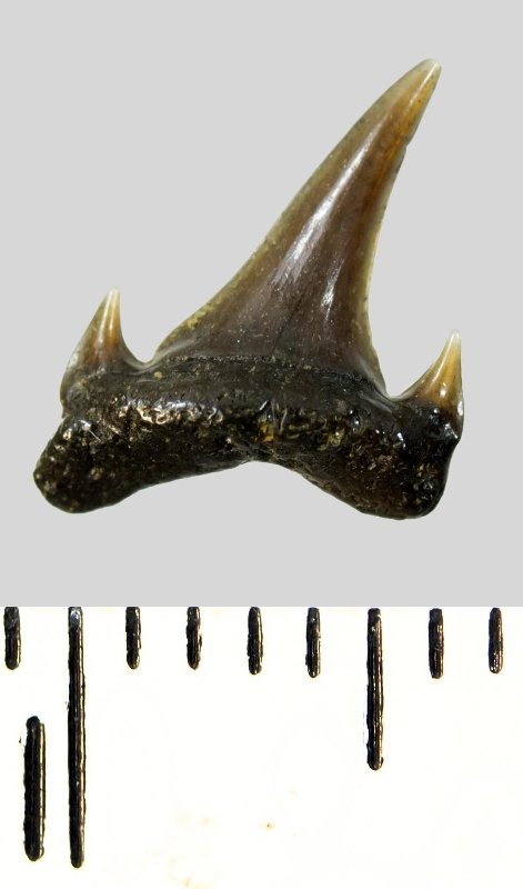 Мелкий боковой зуб с коронкой серого цвета, колюще-режущего типа, S-образно изогнутой, с гладким режущим краем. С лингвальной стороны у основания коронки на эмали имеется скульптура в виде слабой продольной струйчатости. Корень охристый, арочный, умеренно массивный, со следами окатанности. С лингвальной стороны корня одна питательная борозда. Присутствует одна пара добавочных зубцов коронки.
