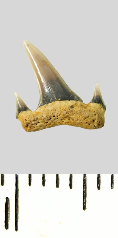 Мелкий боковой зуб с коронкой серого цвета, колюще-режущего типа, S-образно изогнутой, с гладким режущим краем. С лингвальной стороны у основания коронки на эмали имеется скульптура в виде слабой продольной струйчатости. Корень охристый, арочный, умеренно массивный, со следами окатанности. С лингвальной стороны корня одна питательная борозда. Присутствует одна пара добавочных зубцов коронки.