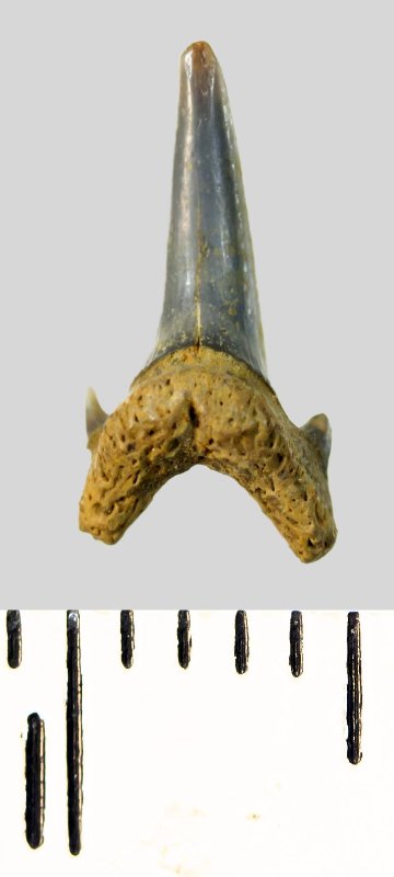 Мелкий боковой зуб с коронкой серого цвета, колюще-режущего типа, S-образно изогнутой, с гладким режущим краем. С лингвальной стороны у основания коронки на эмали имеется скульптура в виде слабой продольной струйчатости. Корень охристый, арочный, умеренно массивный, со следами окатанности. С лингвальной стороны корня одна питательная борозда. Присутствует одна пара добавочных зубцов коронки.