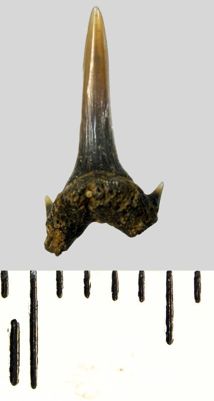 Мелкий боковой зуб с коронкой серого цвета, колюще-режущего типа, S-образно изогнутой, с гладким режущим краем. С лингвальной стороны у основания коронки на эмали имеется скульптура в виде слабой продольной струйчатости. Корень охристый, арочный, умеренно массивный, со следами окатанности. С лингвальной стороны корня одна питательная борозда. Присутствует одна пара добавочных зубцов коронки.