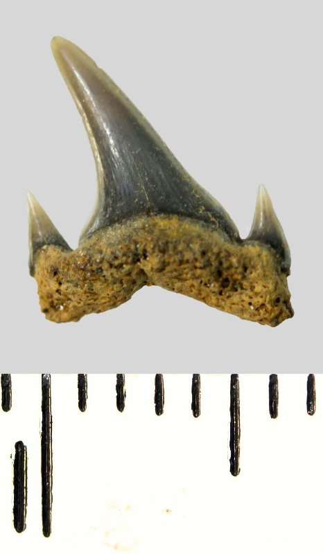 Мелкий боковой зуб с коронкой серого цвета, колюще-режущего типа, S-образно изогнутой, с гладким режущим краем. С лингвальной стороны у основания коронки на эмали имеется скульптура в виде слабой продольной струйчатости. Корень охристый, арочный, умеренно массивный, со следами окатанности. С лингвальной стороны корня одна питательная борозда. Присутствует одна пара добавочных зубцов коронки.