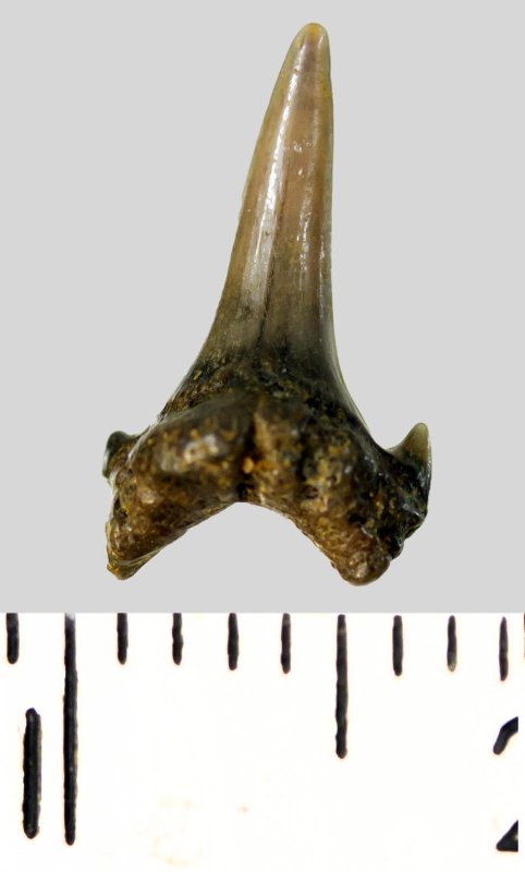 Мелкий боковой зуб с коронкой серого цвета, колюще-режущего типа, S-образно изогнутой, с гладким режущим краем. С лингвальной стороны у основания коронки на эмали имеется скульптура в виде слабой продольной струйчатости. Корень охристый, арочный, умеренно массивный, со следами окатанности. С лингвальной стороны корня одна питательная борозда. Присутствует одна пара добавочных зубцов коронки.