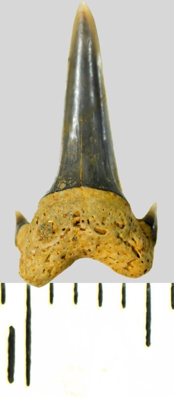 Мелкий боковой зуб с коронкой серого цвета, колюще-режущего типа, S-образно изогнутой, с гладким режущим краем. С лингвальной стороны у основания коронки на эмали имеется скульптура в виде слабой продольной струйчатости. Корень охристый, арочный, умеренно массивный, со следами окатанности. С лингвальной стороны корня одна питательная борозда. Присутствует одна пара добавочных зубцов коронки.