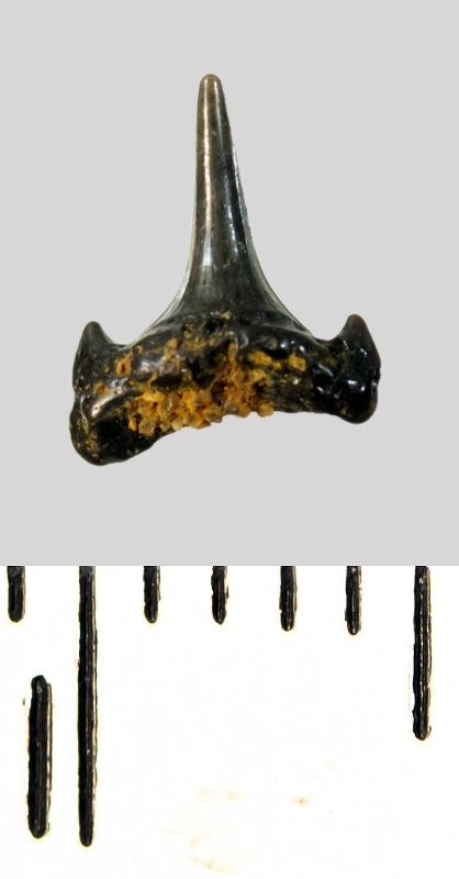 Мелкий боковой зуб с коронкой серого цвета, колюще-режущего типа, S-образно изогнутой, с гладким режущим краем. С лингвальной стороны у основания коронки на эмали имеется скульптура в виде слабой продольной струйчатости. Корень охристый, арочный, умеренно массивный, со следами окатанности. С лингвальной стороны корня одна питательная борозда. Присутствует одна пара добавочных зубцов коронки.