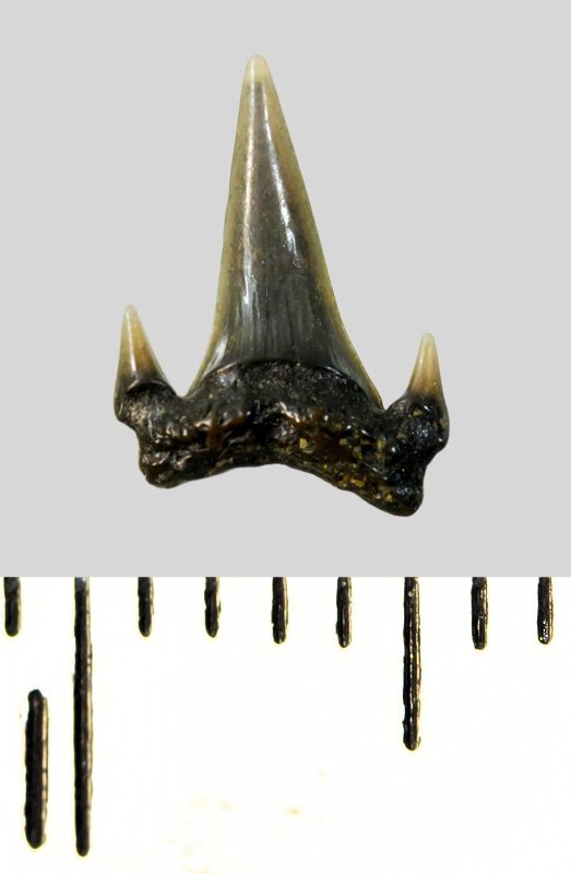 Мелкий боковой зуб с коронкой серого цвета, колюще-режущего типа, S-образно изогнутой, с гладким режущим краем. С лингвальной стороны у основания коронки на эмали имеется скульптура в виде слабой продольной струйчатости. Корень охристый, арочный, умеренно массивный, со следами окатанности. С лингвальной стороны корня одна питательная борозда. Присутствует одна пара добавочных зубцов коронки.