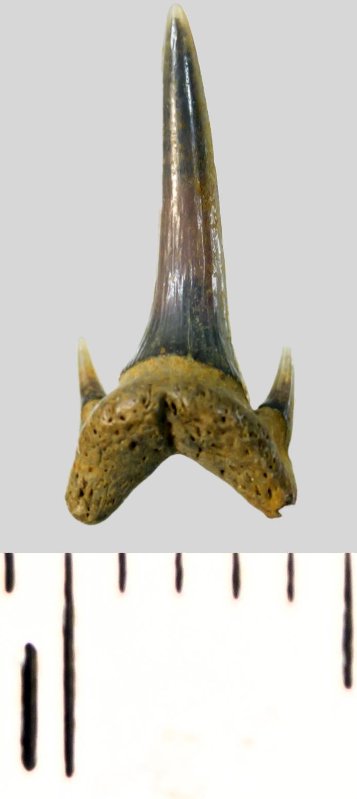 Мелкий боковой зуб с коронкой серого цвета, колюще-режущего типа, S-образно изогнутой, с гладким режущим краем. С лингвальной стороны у основания коронки на эмали имеется скульптура в виде слабой продольной струйчатости. Корень охристый, арочный, умеренно массивный, со следами окатанности. С лингвальной стороны корня одна питательная борозда. Присутствует одна пара добавочных зубцов коронки.
