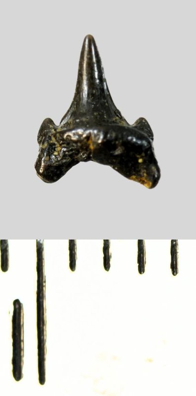 Мелкий боковой зуб с коронкой серого цвета, колюще-режущего типа, S-образно изогнутой, с гладким режущим краем. С лингвальной стороны у основания коронки на эмали имеется скульптура в виде слабой продольной струйчатости. Корень охристый, арочный, умеренно массивный, со следами окатанности. С лингвальной стороны корня одна питательная борозда. Присутствует одна пара добавочных зубцов коронки.
