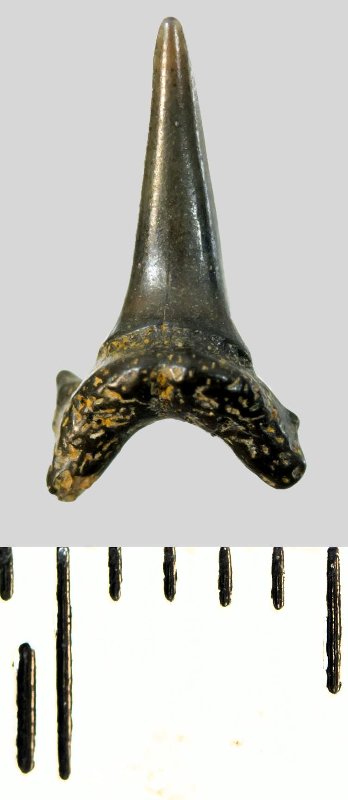 Мелкий боковой зуб с коронкой серого цвета, колюще-режущего типа, S-образно изогнутой, с гладким режущим краем. С лингвальной стороны у основания коронки на эмали имеется скульптура в виде слабой продольной струйчатости. Корень охристый, арочный, умеренно массивный, со следами окатанности. Имеется одна питательная борозда с лингвальной стороны корня. Имелась одна пара добавочных зубцов коронки, сохранился только левый.