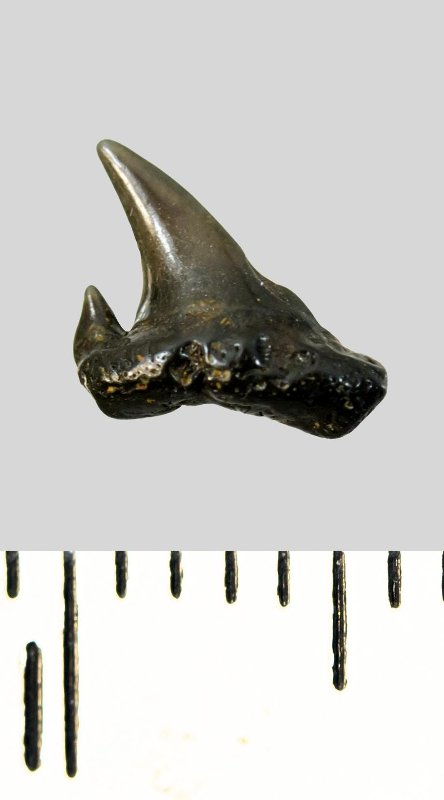 Мелкий боковой зуб с коронкой серого цвета, колюще-режущего типа, S-образно изогнутой, с гладким режущим краем. С лингвальной стороны у основания коронки на эмали имеется скульптура в виде слабой продольной струйчатости. Корень охристый, арочный, умеренно массивный, со следами окатанности. Имеется одна питательная борозда с лингвальной стороны корня. Имелась одна пара добавочных зубцов коронки, сохранился только левый.