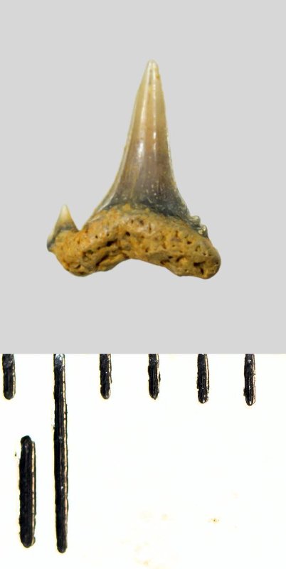 Мелкий боковой зуб с коронкой серого цвета, колюще-режущего типа, S-образно изогнутой, с гладким режущим краем. С лингвальной стороны у основания коронки на эмали имеется скульптура в виде слабой продольной струйчатости. Корень охристый, арочный, умеренно массивный, со следами окатанности. Имеется одна питательная борозда с лингвальной стороны корня. Имелась одна пара добавочных зубцов коронки, сохранился только левый.