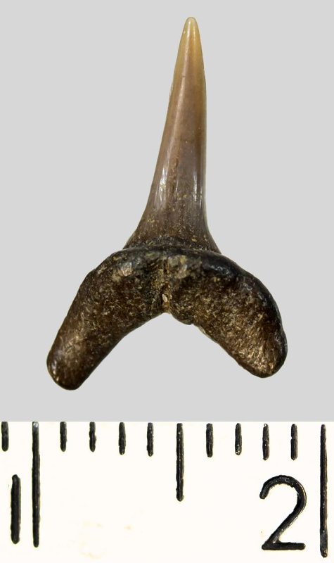 Мелкий боковой зуб с коронкой серого цвета, колюще-режущего типа, S-образно изогнутой, с гладким режущим краем. С лингвальной стороны у основания коронки на эмали имеется скульптура в виде слабой продольной струйчатости. Корень охристый, арочный, умеренно массивный, со следами окатанности. Имеется одна питательная борозда с лингвальной стороны корня. Добавочные зубцы коронки отсутствуют.