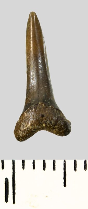 Мелкий боковой зуб с коронкой серого цвета, колюще-режущего типа, S-образно изогнутой, с гладким режущим краем. С лингвальной стороны у основания коронки на эмали имеется скульптура в виде слабой продольной струйчатости. Корень охристый, арочный, умеренно массивный, со следами окатанности. Имеется одна питательная борозда с лингвальной стороны корня. Добавочные зубцы коронки отсутствуют.
