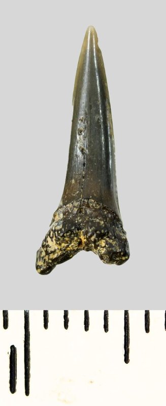 Мелкий боковой зуб с коронкой серого цвета, колюще-режущего типа, S-образно изогнутой, с гладким режущим краем. С лингвальной стороны у основания коронки на эмали имеется скульптура в виде слабой продольной струйчатости. Корень охристый, арочный, умеренно массивный, со следами окатанности. Имеется одна питательная борозда с лингвальной стороны корня. Добавочные зубцы коронки отсутствуют.
