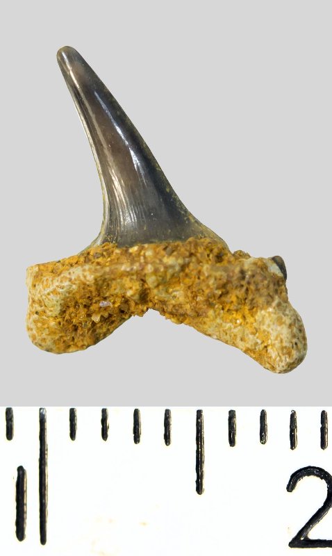 Мелкий боковой зуб с коронкой серого цвета, колюще-режущего типа, S-образно изогнутой, с гладким режущим краем. С лингвальной стороны у основания коронки на эмали имеется скульптура в виде слабой продольной струйчатости. Корень охристый, арочный, умеренно массивный, со следами окатанности. Имеется одна питательная борозда с лингвальной стороны корня. Добавочные зубцы коронки отсутствуют.