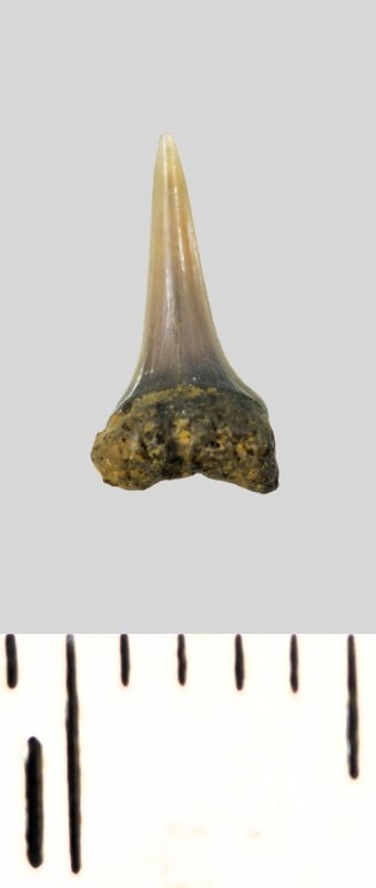Мелкий боковой зуб с коронкой серого цвета, колюще-режущего типа, S-образно изогнутой, с гладким режущим краем. С лингвальной стороны у основания коронки на эмали имеется скульптура в виде слабой продольной струйчатости. Корень охристый, арочный, умеренно массивный, со следами окатанности. Имеется одна питательная борозда с лингвальной стороны корня. Добавочные зубцы коронки отсутствуют.