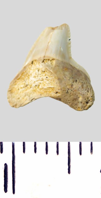 Зуб. Акула. Palaeoanacorax intermedius Glueckman, 1971. Классификация: Хордовые Chordata, Позвоночные Vertebrata, Хрящевые рыбы Chondrichthyes, Пластиножаберные Elasmobranchii, Акулы Selachii, Ламнообразные Lamniformes, Anacoracidae