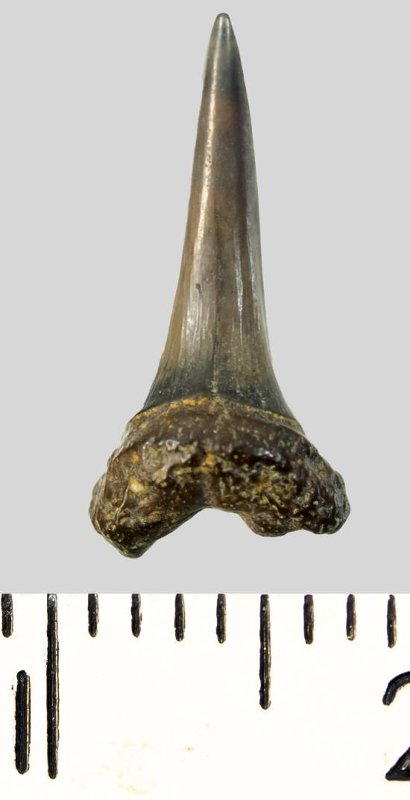 Мелкий боковой зуб с коронкой серого цвета, колюще-режущего типа, S-образно изогнутой, с гладким режущим краем. С лингвальной стороны у основания коронки на эмали имеется скульптура в виде слабой продольной струйчатости. Корень охристый, арочный, умеренно массивный, со следами окатанности. Имеется одна питательная борозда с лингвальной стороны корня. Добавочные зубцы коронки отсутствуют.