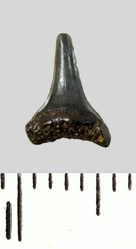 Мелкий боковой зуб с коронкой серого цвета, колюще-режущего типа, S-образно изогнутой, с гладким режущим краем. С лингвальной стороны у основания коронки на эмали имеется скульптура в виде слабой продольной струйчатости. Корень охристый, арочный, умеренно массивный, со следами окатанности. Имеется одна питательная борозда с лингвальной стороны корня. Добавочные зубцы коронки отсутствуют.