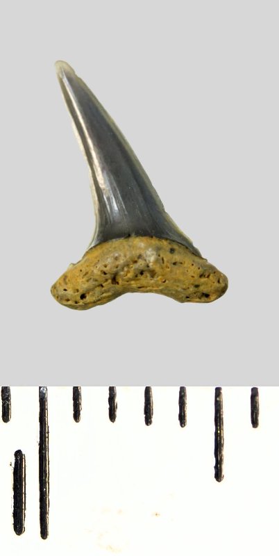 Мелкий боковой зуб с коронкой серого цвета, колюще-режущего типа, S-образно изогнутой, с гладким режущим краем. С лингвальной стороны у основания коронки на эмали имеется скульптура в виде слабой продольной струйчатости. Корень охристый, арочный, умеренно массивный, со следами окатанности. Имеется одна питательная борозда с лингвальной стороны корня. Добавочные зубцы коронки отсутствуют.