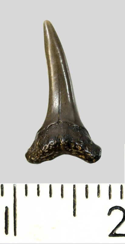 Мелкий боковой зуб с коронкой серого цвета, колюще-режущего типа, S-образно изогнутой, с гладким режущим краем. С лингвальной стороны у основания коронки на эмали имеется скульптура в виде слабой продольной струйчатости. Корень охристый, арочный, умеренно массивный, со следами окатанности. Имеется одна питательная борозда с лингвальной стороны корня. Добавочные зубцы коронки отсутствуют.