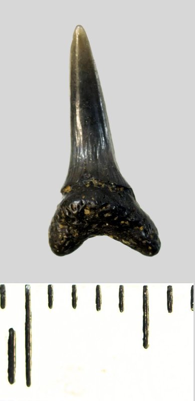Мелкий боковой зуб с коронкой серого цвета, колюще-режущего типа, S-образно изогнутой, с гладким режущим краем. С лингвальной стороны у основания коронки на эмали имеется скульптура в виде слабой продольной струйчатости. Корень охристый, арочный, умеренно массивный, со следами окатанности. Имеется одна питательная борозда с лингвальной стороны корня. Добавочные зубцы коронки отсутствуют.