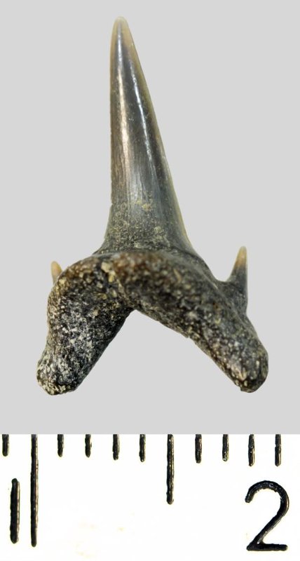 Мелкий боковой зуб с коронкой серого цвета, колюще-режущего типа, S-образно изогнутой, с гладким режущим краем. С лингвальной стороны у основания коронки на эмали имеется скульптура в виде слабой продольной струйчатости. Корень охристый, арочный, умеренно массивный, со следами окатанности. С лингвальной стороны корня одна питательная борозда. Присутствует одна пара добавочных зубцов коронки.