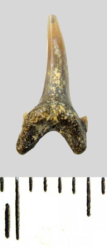 Мелкий боковой зуб с коронкой серого цвета, колюще-режущего типа, S-образно изогнутой, с гладким режущим краем. С лингвальной стороны у основания коронки на эмали имеется скульптура в виде слабой продольной струйчатости. Корень охристый, арочный, умеренно массивный, со следами окатанности. С лингвальной стороны корня одна питательная борозда. Присутствует одна пара добавочных зубцов коронки.