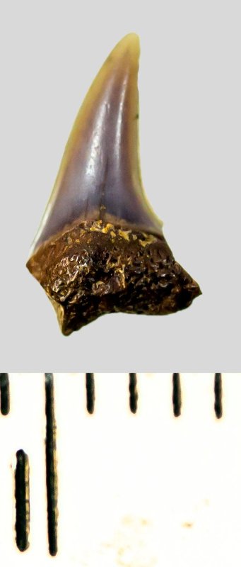 Зуб (фрагмент). Акула. Eostriatolamia subulata (Agassiz, 1843). Классификация: Хордовые Chordata, Позвоночные Vertebrata, Хрящевые рыбы Chondrichthyes, Пластиножаберные Elasmobranchii, Акулы Selachii, Ламнообразные Lamniformes, Песчаные акулы Odontaspididae