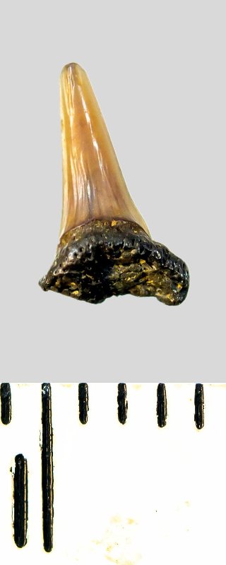 Зуб (фрагмент). Акула. Eostriatolamia subulata (Agassiz, 1843). Классификация: Хордовые Chordata, Позвоночные Vertebrata, Хрящевые рыбы Chondrichthyes, Пластиножаберные Elasmobranchii, Акулы Selachii, Ламнообразные Lamniformes, Песчаные акулы Odontaspididae