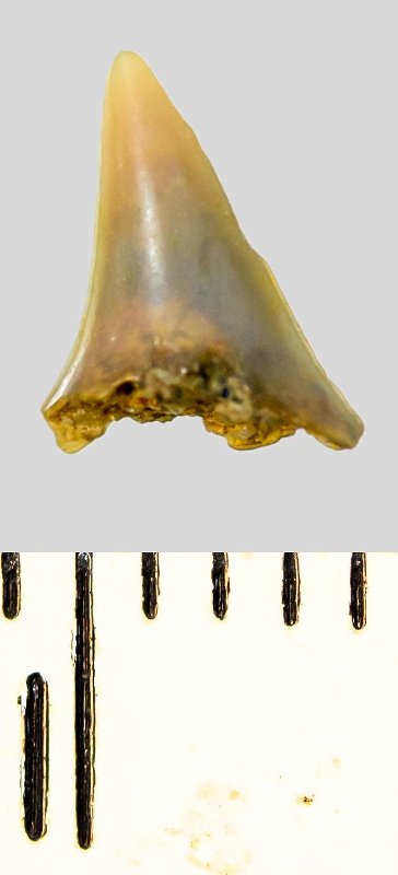 Зуб (фрагмент). Акула. Lamniformes gen. indet. Классификация: Хордовые Chordata, Позвоночные Vertebrata, Хрящевые рыбы Chondrichthyes, Пластиножаберные Elasmobranchii, Акулы Selachii, Ламнообразные Lamniformes