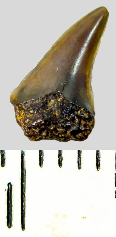 Зуб (фрагмент). Акула. Lamniformes gen. indet. Классификация: Хордовые Chordata, Позвоночные Vertebrata, Хрящевые рыбы Chondrichthyes, Пластиножаберные Elasmobranchii, Акулы Selachii, Ламнообразные Lamniformes