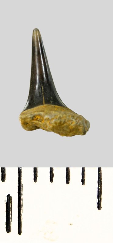 Зуб. Акула. Eostriatolamia subulata (Agassiz, 1843). Классификация: Хордовые Chordata, Позвоночные Vertebrata, Хрящевые рыбы Chondrichthyes, Пластиножаберные Elasmobranchii, Акулы Selachii, Ламнообразные Lamniformes, Песчаные акулы Odontaspididae